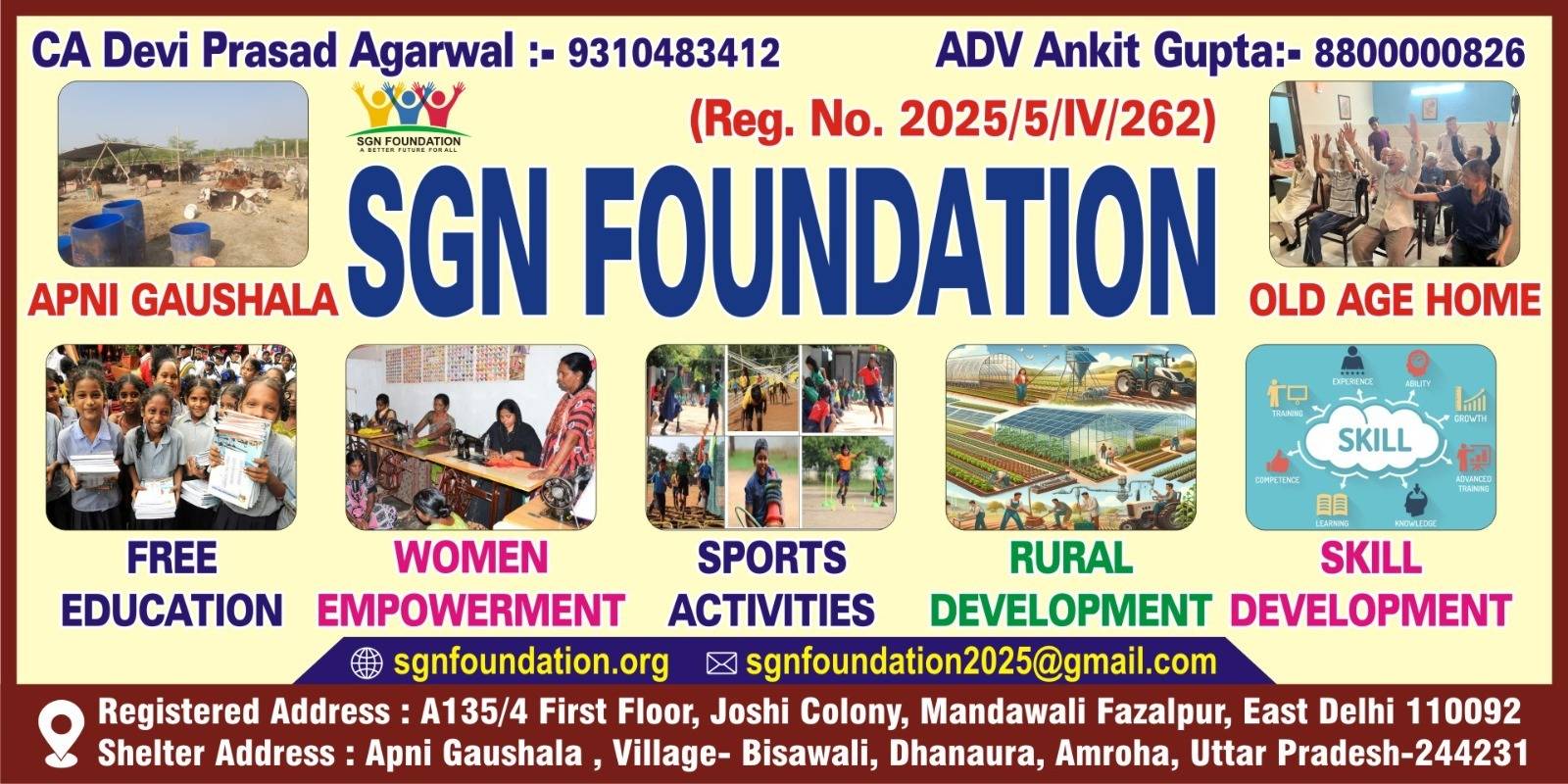 SGN FOUNDATION (Sri Ganeshay Namah Foundation) is a registered non-governmental organization dedicated to the holistic development of society. The acronym SGN stands for “Sri Ganeshay Namah”, symbolizing an auspicious beginning and spiritual inspiration behind all our initiatives. Our mission is to reach and uplift the underserved sections of society, promoting dignity, equality, and self-reliance.